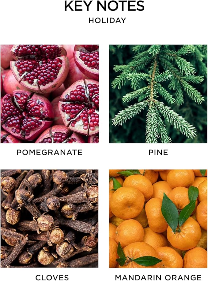 - CITRUS & WOODY - Pomegranate, mandarin orange, pine, cloves, and cinnamon blend with a hint of vanilla and amber in this sophisticated fragrance, instantly providing the aroma of a sparkling holiday season.