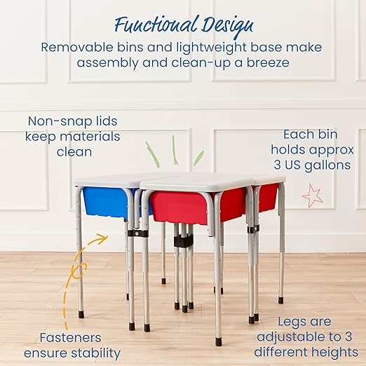 - Product Dimensions: Table measures 30.32" W × 30.32" D and can adjust to three heights: 20”, 22.5” or 26" H; bins hold approximately 3 U.S. gallons; Adult Active Engaged & Direct Supervision Required