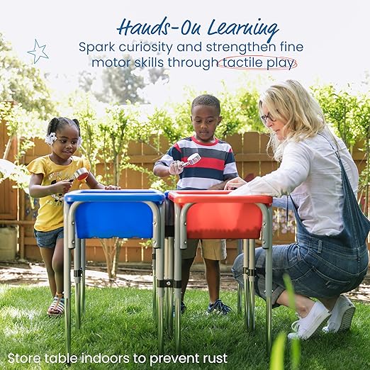 - Indoors and Outdoors: Play tables can be used in the backyard, outdoor play area, classroom, playroom; cover basins with secure lids to keep contents dry; bring tables inside to prevent rust