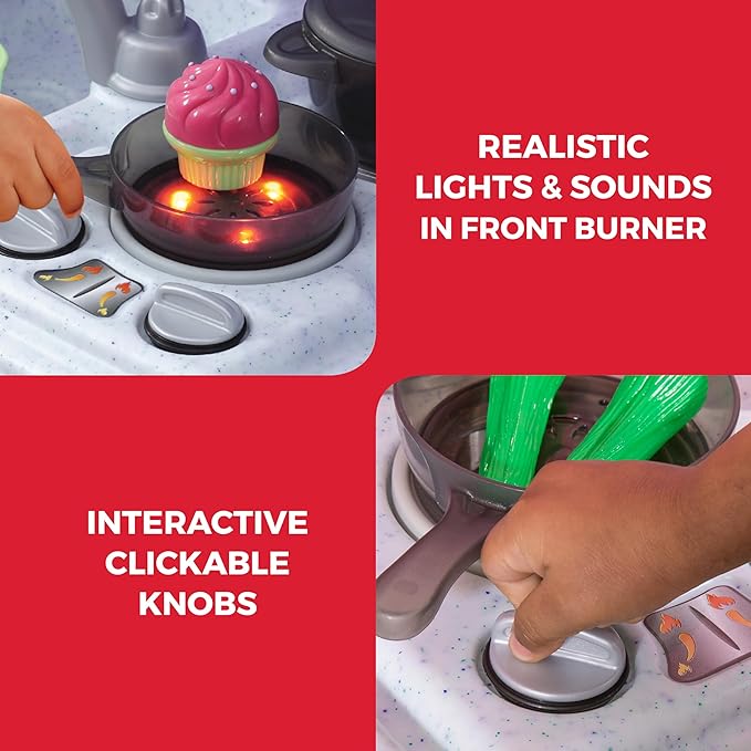 - Accessories include a special frying pan and boiling pot that make realistic frying and boiling sounds when placed on the stoves burner