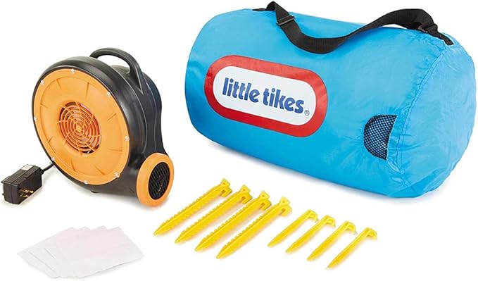 - Stakes anchor the bouncer firmly in place, while a heavy-duty blower provides continuous airflow