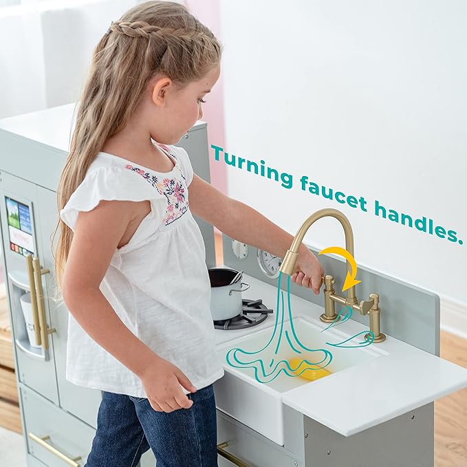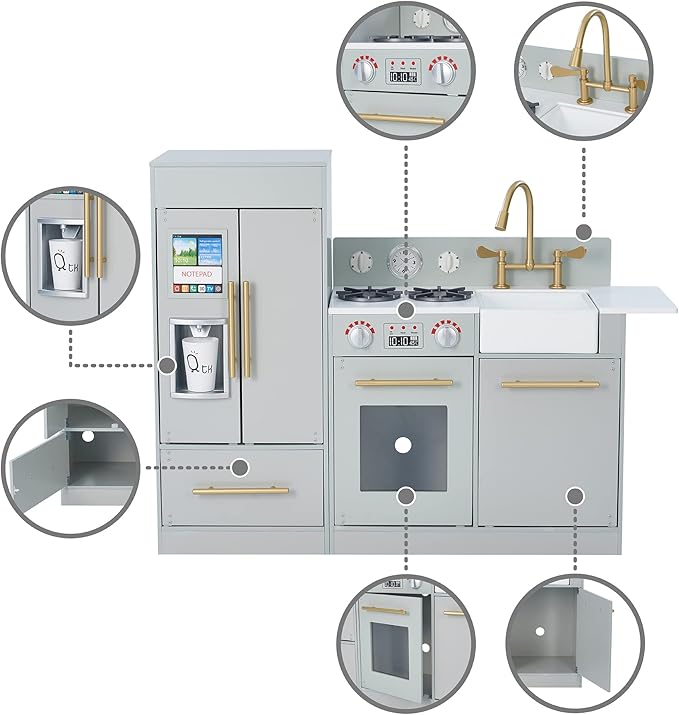 Teamson Kids Little Chef Charlotte Modern Modular Interactive Wooden Play Kitchen with Refrigerator, Stove and Sink in Gray with Gold Accents