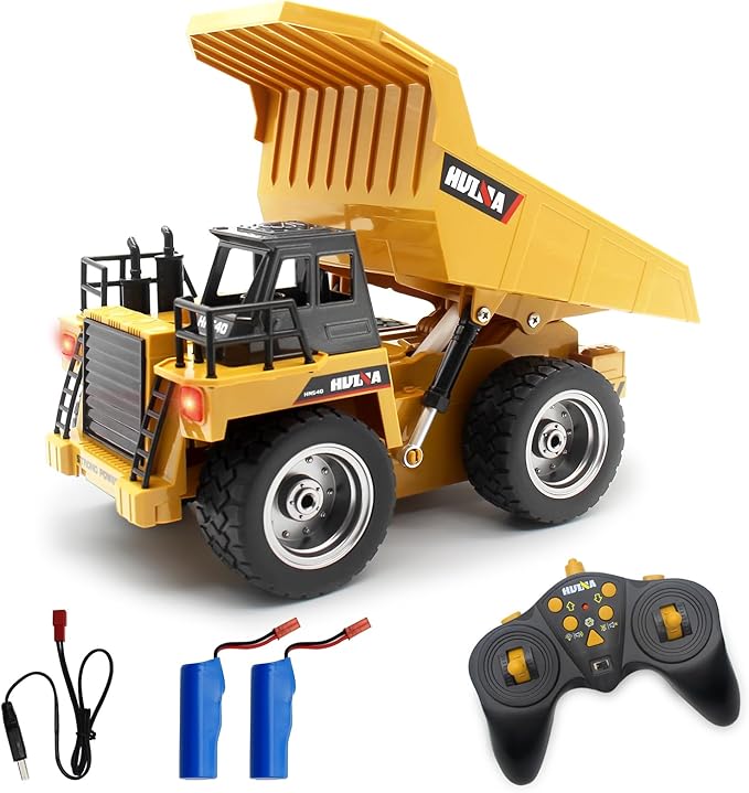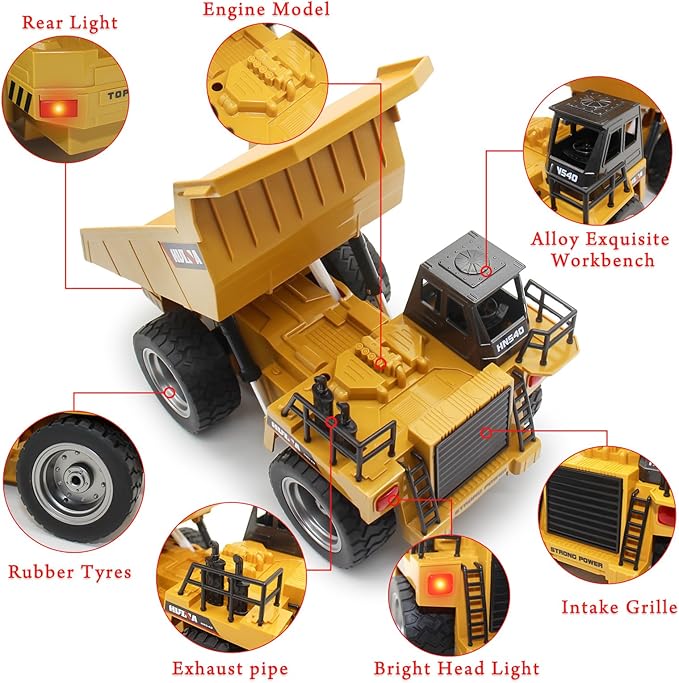 - 4 Wheel Drive & 6 Channel: Go forward / backward; Turn left / right; Dump bed up and down. 4 Wheels drive, enough power to fully load.