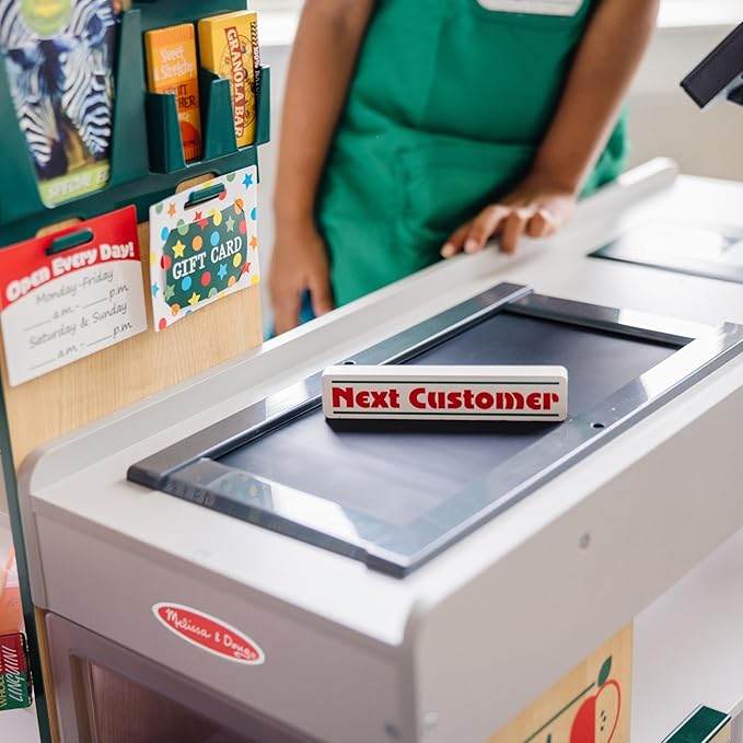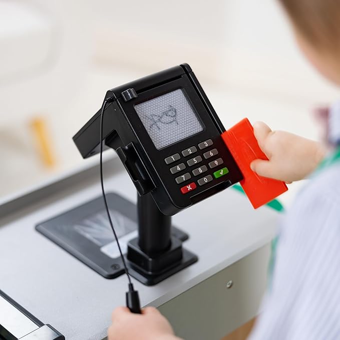 - Includes hand-cranked conveyor belt, beeping “scanner,” bagging area, card swipe machine, and cash drawer