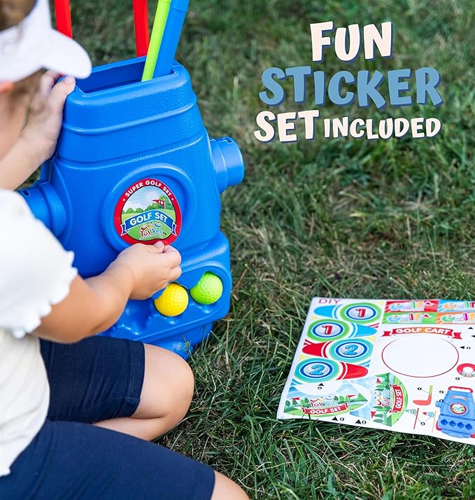 - COMPLETE BEGINNER GOLF SET: The ToyVelt Toddler Golf Set includes 4 colorful golf clubs, 6 special balls, 2 practice holes, a putting mat, and a practical golf cart with wheels, offering a complete set for your little golfer