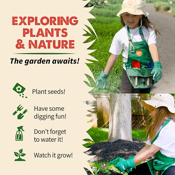 - 🌾 IDEAL GIFT: These kids garden tools are perfect for a kid's social development while learning about nature, and learning how to grow plants, fruits & vegetables. Teach them how to dig and plant with our child-friendly gardening kit for kids while using our childrens gardening gloves and kids apron to ensure an enjoyable yet safe planting experience