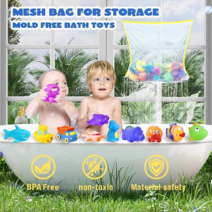 - BABY BATH TOYS: A delightful set of 24 colorful and engaging bath toys, including marine animals, dinosaurs, and vehicles, making bath time exciting for babies and toddlers.