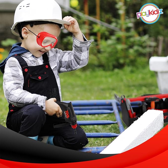 Playkidz Tool Box for Kids 22-Piece Boys & Girls Construction Toy Playset w/Carry Chest, Working Push Button Power Drill, Hammer, Screwdriver, Wrench, Pliers, Saw & Other Realistic Tools Ages 3+