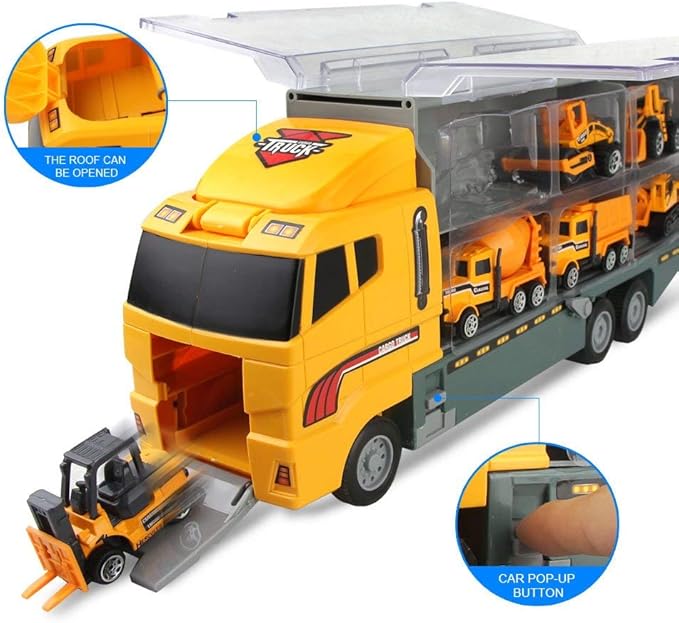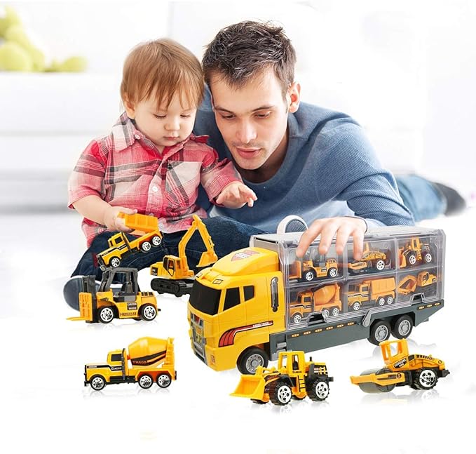 - Great Designs - Coolplay 11 Mini Construction Truck Toy Set in Different Designs and Functions in One Carrier Truck. Including Helicopter, Wheel Loader, Dump Truck, Bulldozer, Excavator, Mixer, Backhoe, Road Roller, and so on.