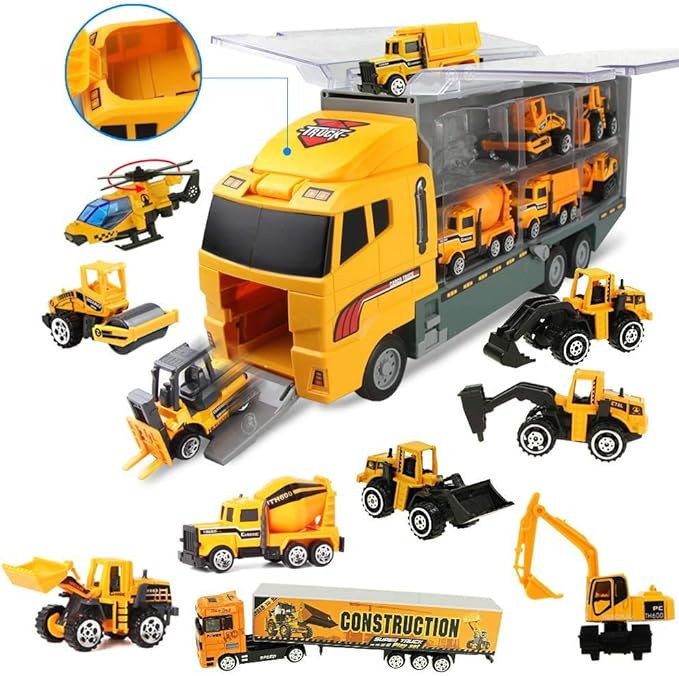 - Package Included: 1× Big Carrier Truck, 1× Helicopter, 1×Wheel Loader, 1× Dump Truck, 2× Excavator, 1× Backhoe, 1× Mixer, 1× Road Roller, 1× Drilling Truck, 1× Lorry, 1× Forklift; Package: printed box