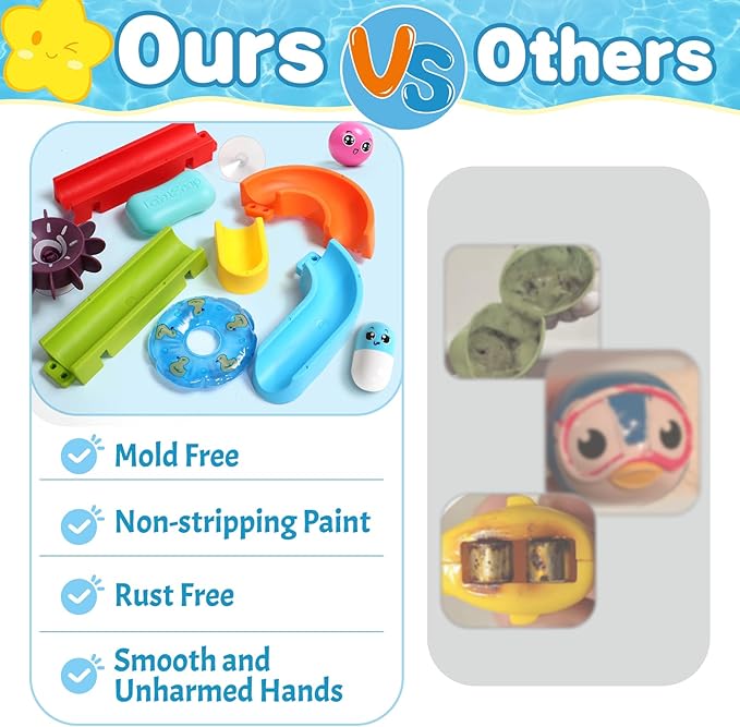 - 【Upgraded Bath Toys】 Our bath toys for kids aged 3-5 and 4-8 are made of durable plastic. The semi-open track design is easier to wash than tubular bath toys and eliminates the need for sliding duck accessories with metal rollers. With no sharp edges or metal parts that could rust in water, these toys ensure a safe and worry-free water playtime for your kids.