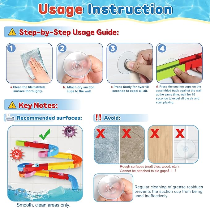 - 【Where Can You Play?】 These bath toys for kids aged 3-5 and 4-8 can be used not only in the bathroom but also on windows, mirrors, fridges, or other smooth surfaces—with or without water. For the best suction, use on smooth and clean surfaces. Avoid using on non-smooth or matte tiles. If the suction cups don’t stick well, try soaking them in hot water for a few minutes, then wipe them dry before use.
