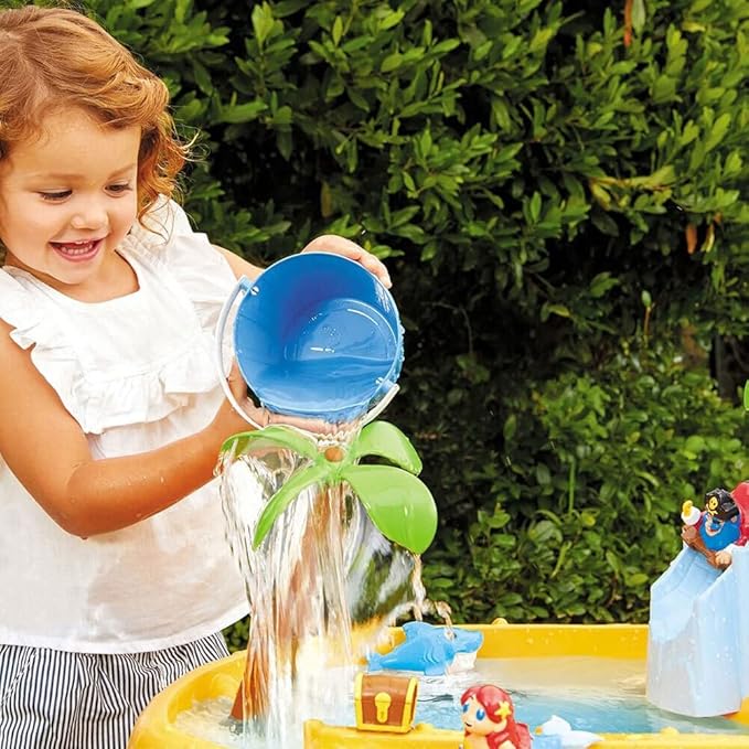- Comes with island-themed characters, including: a shark, a mermaid, a narwhal, a pirate on a boat, a treasure chest, and a water bucket