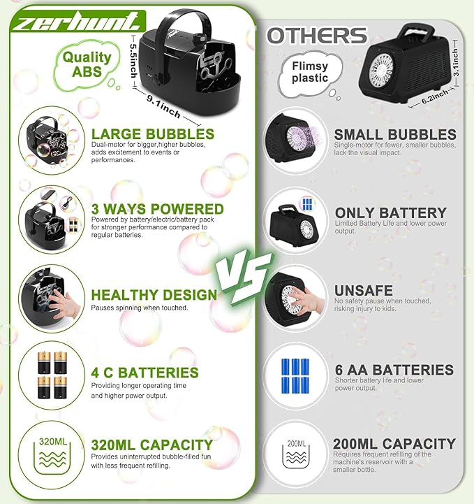 - 【High Output 18000+ Big Colorful Bubbles】Upgraded Zerhunt Bubble Machine Can Generate More Than 18000+ Bubbles Per Minute With 6 Spinning Wands,2 Speed Level & Super Built-In Motor. It Can Blow Tons of Colorful Bubbles Faster, Higher And Further Even Inside With No Wind.