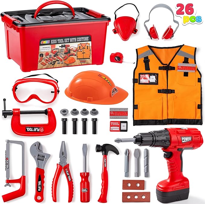 JOYIN 26Pcs Kid Tool Set, Pretend Play Toddler Tool Toy with Construction Worker Costume & Electronic Toy Drill in Storage Box for Boy Girl Halloween Present Birthday Dress Up Party