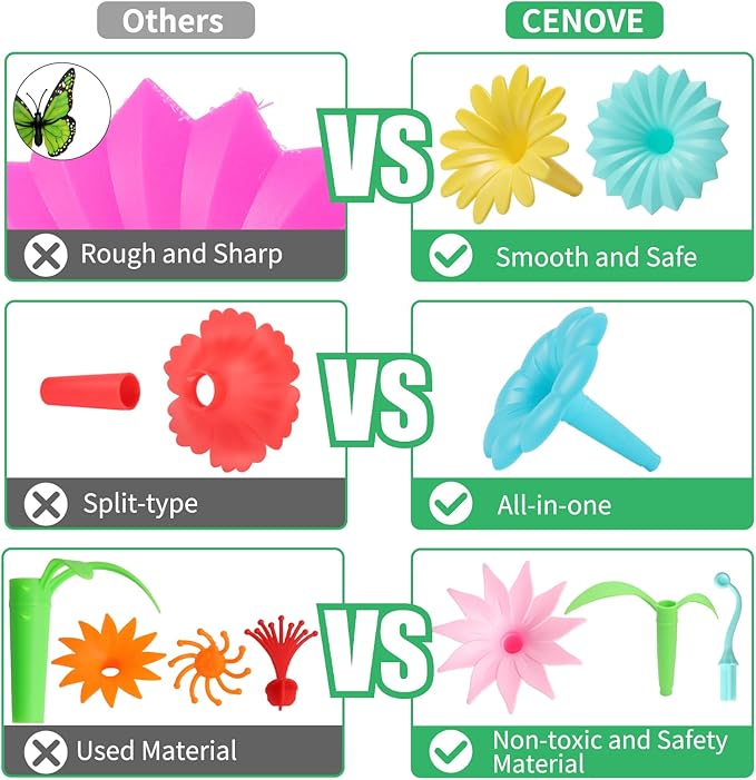 - Safety Toddler Toy:CENOVE pretend flower garden toy set is made with Eco-friendly materials. BPA-Free,Non-toxic, No smell.Smooth surface,won't hurt kids' hands.Meet with ASTM F963-16/-17 and CPSIA safety standards.