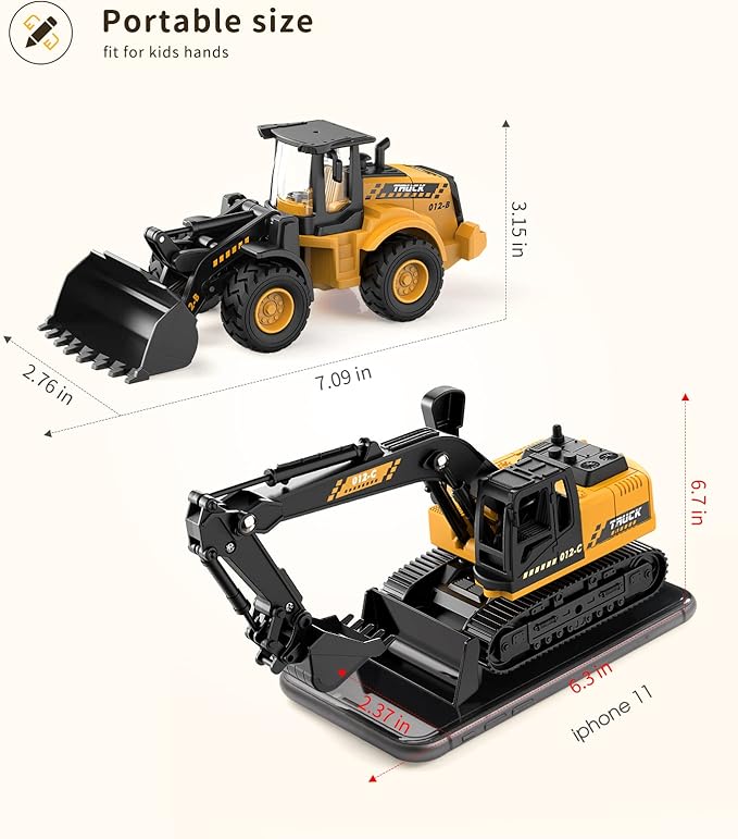 - PORTABLE SIZE SUITABLE FOR OUTDOOR AND INDOOR: Excavator measure 6.7 x6.3x2.37”, Bulldozer 7 x 2.7 x 3.15” .Bulldozer is Push and go Cars, no any battery need .