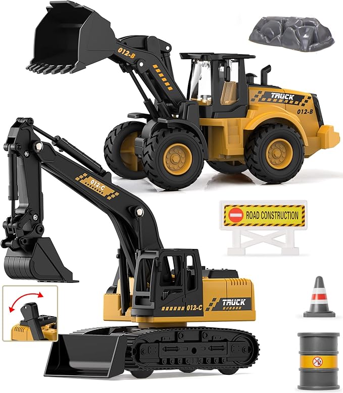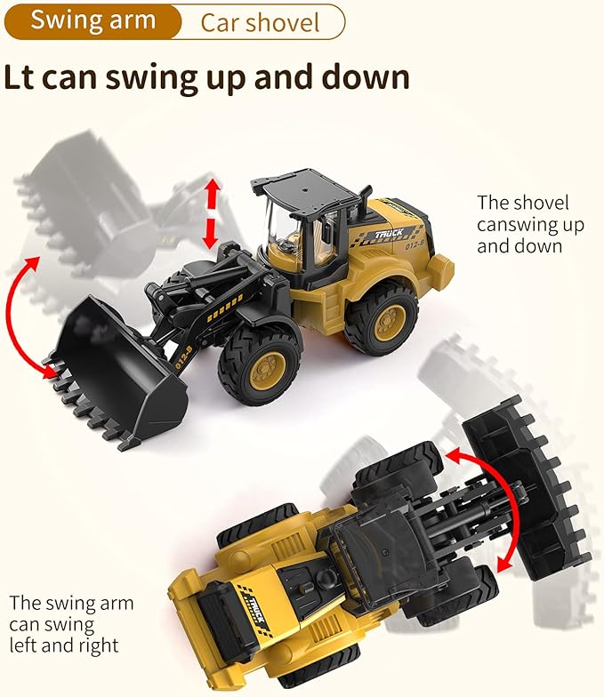 - SIMULATION CONSTRUCTION VEHICLES: Both looks and works like a real Vehicles. Excavator can move 360 degrees and shovel arm has an operating handle. Bulldozer truck, Swing can up and down, shovel can load and dump sand/gravel/soil. Compact but not cumbersome for kids, easy to play and carry.