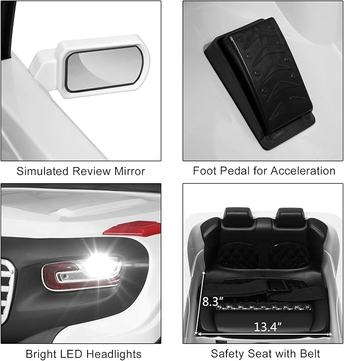 - REALISTIC DESIGN - It is a realistic and stylish cars with bright LED headlights, adjustable safety seatbelt, easy start/stop buttonand and working horns, etc. Overall dimension: 37.8"(L) x 24.4"(W) x 19.5"(H). The seat size: 13.39"(Width) x 8.27"(Depth). The Maximum weight capacity is 66 LBS.