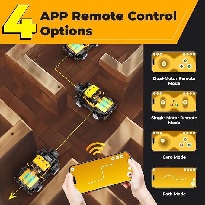 - Remote Control Car: The smart car can be controlled via a phone app using Bluetooth. It features 4 user-friendly remote control modes: dual-motor, single-motor, gyro, and path mode. By downloading the free Apitor Kit app and following the step-by-step instructions, kids can learn how to master programming robots all by themselves.