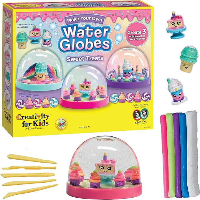 - 3 SWEET TREAT SNOW GLOBES: Making a dessert-themed snow globe is easy with vibrant colored non-drying clay! This complete arts & crafts kit for kids includes sparkly glitter, stickers, and sweet figurines provided in this DIY snow globe kit. Give the snow globes as a handmade gift or display them in your room!