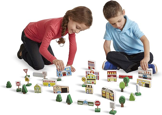 Melissa & Doug Wooden Town Play Set With Storage Tray (32 pcs) Pretend Play Wooden Town Set For Kids With Storage