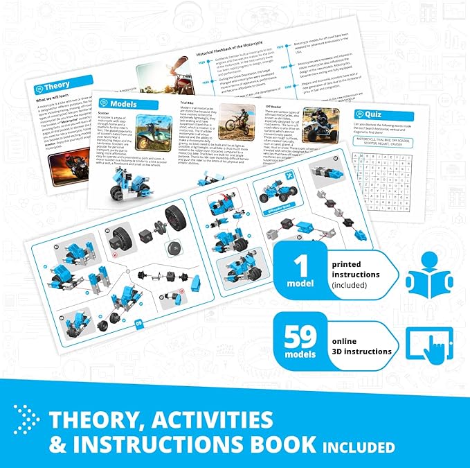 - EASY TO USE – This kit provides 2 printed and 58 online instructions to build 60 engineering toy models including a trial bike, an excavator, a Formula 1 race car, and many more. All the pieces can easily be stored and kept safe in their plastic tub. Handle color may vary.