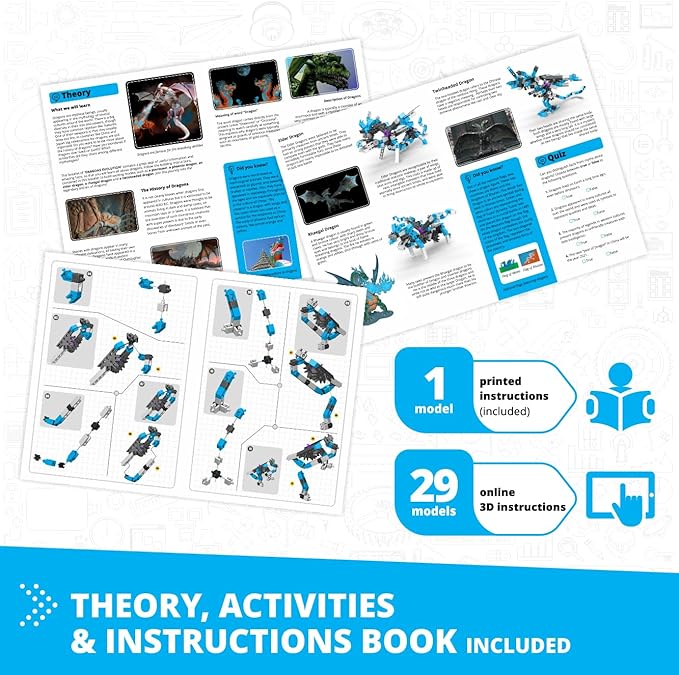 - EASY TO USE – This kit provides 2 printed and 38 online instructions to build 30 engineering toy models including a space rocket, a lunar rover, an Elder Dragon, a rocked-fueled dragster, and many more. All the pieces can easily be stored and kept safe in their plastic tub. Handle color may vary.