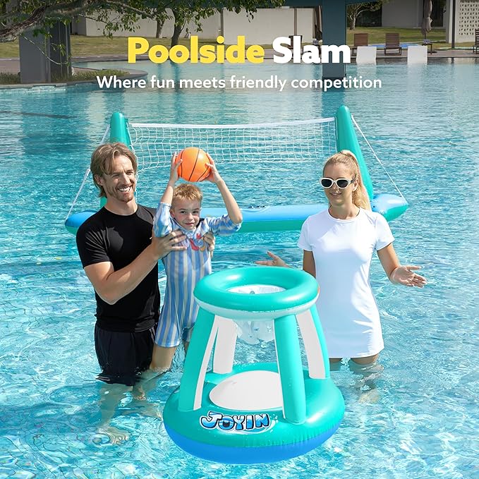 - Inflatable Pool Float Set includes an Inflatable Volleyball Court with 2 Weight Bags, an Inflatable Basketball Hoops, an Inflatable Volleyball and an Inflatable Basketball.