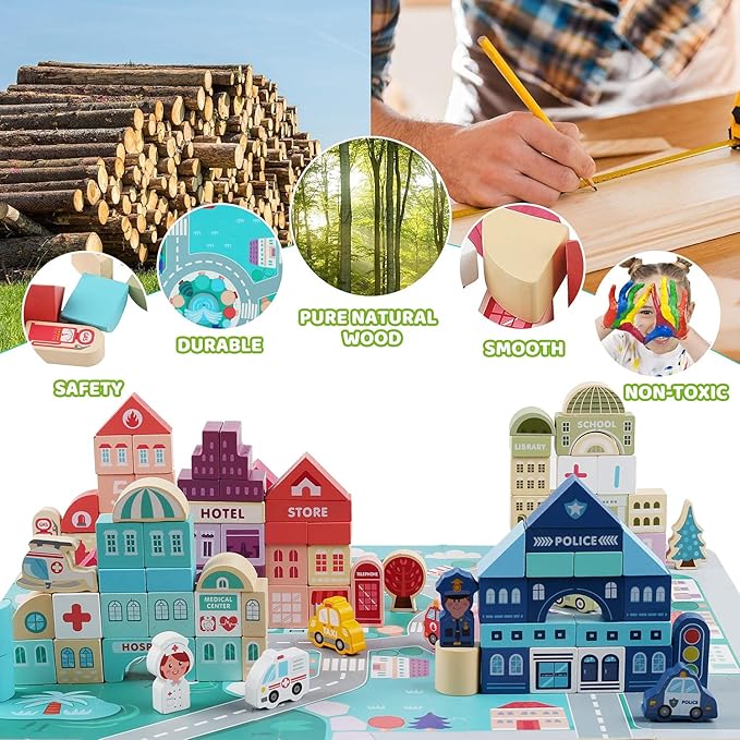 - 【Multiple Scene Combination】The building blocks include library, school, hospital, police office, hotel, cars and so on; And cute floor jigsaw puzzle also provides more playability and interest for the scene. This wooden toys can encourage children to understand the construction and transportation of various cities.