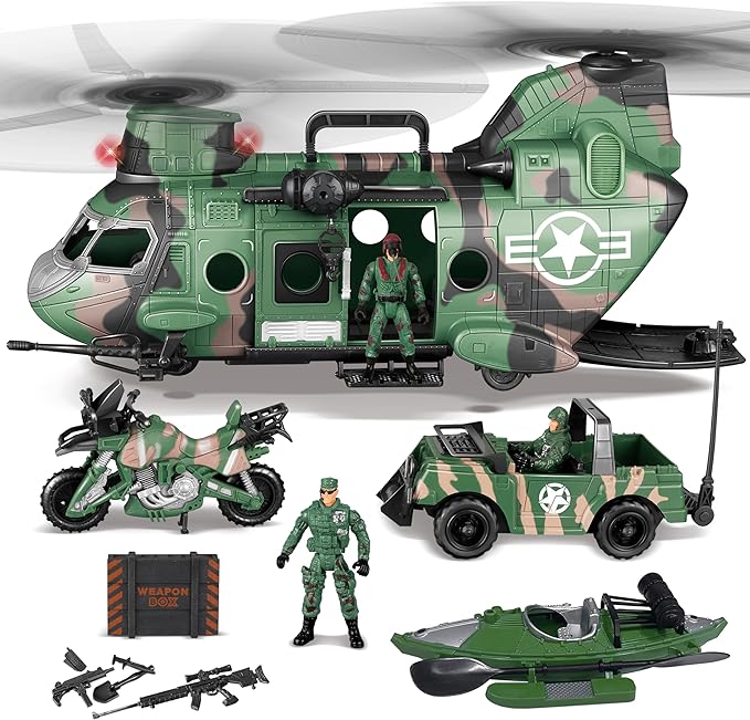 - SUPER VALUE PACK. Our pretend-n-play helicopter toy set includes 1 jumbo transport helicopter, 1 military truck, 1 kayak boat, 1 military motorcycle, 3 army men action figures (4 inches), 1 weapon box and various equipment figures.