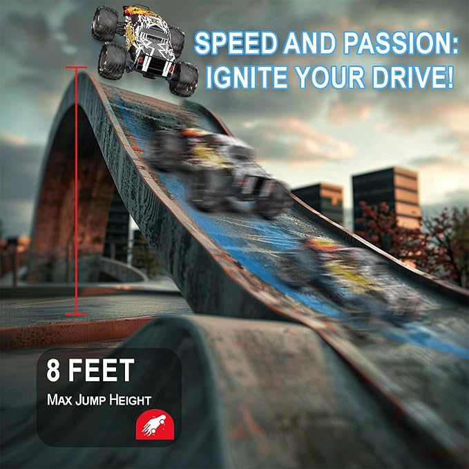 - Moter with Professional Metal Heat Sink: The monster truck is equipped with a 380 motor that can perform 21500 revs per minute, which made a huge enhancement for the acceleration and allows the RC car to have a top speed of 40+ km/h. There is a metal heat sink that fully covers the motor to enhance motor heat dissipation so as to extend motor life. Please note that the motor gets heated when the truck has been driven for a long time. We recommend you pause intermittently after 15 mins driving.