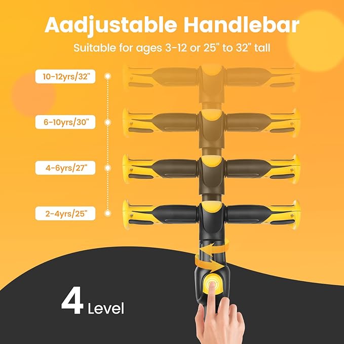 - 【Adjustable Handlebar】With 4-level adjustable handlebar with new safety lift lock, Scooter suitable for ages 3-12 or 25" to 32" tall. Solve the trouble of changing kids scooter due to insufficient handlebar height. Your child can ride for the next 3-4 years.