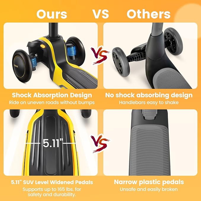 - 【Safe and Durable】 The progressive braking system prevents the scooter for kids ages 6-12 from rolling over due to sudden braking. The aluminum alloy reinforced frame, high-strength structural and SUV-level 5.11'' widened pedals allow the actual bear weight 110lbs(higher than similar products). The built-in stable triangular structure prevents rollover, bringing your kids a smooth and safe ride experience.