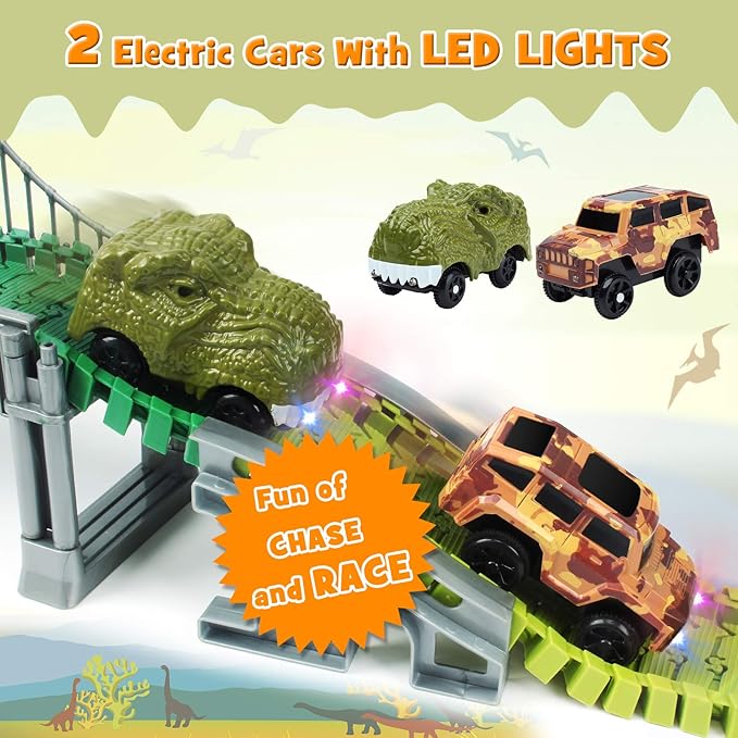 - 【Customizable Combinations】 - Dinosaur race track set for kids girls features 200 flexible tracks that can be easily put together, twist and adjust to form in different ways. Children will play by their own rules with endless options and to have limitless possibilities in building different road race tracks for great indoor moments.