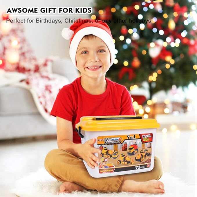 - Updated Version: We updated 71 Pcs play set with Lights Sounds (batteries included). Contain with user manual, screwdriver and toy power drill(batteries notincluded) for taking apart the truck. Use storage box to store parts or travel with it