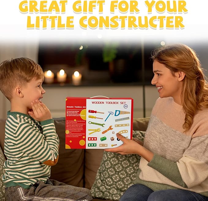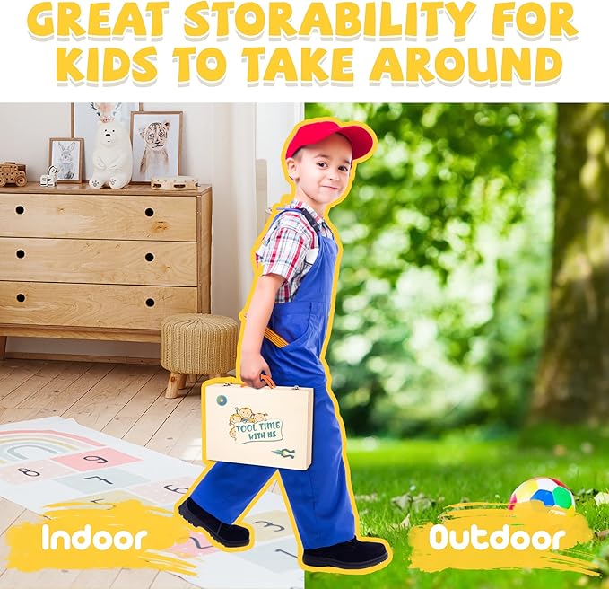 - 🛠Premium Solid Wood : Designed to last, we carefully selected first-class solid wood to make these wooden tools. They are non-sharp compared with real tools, protecting small hands from being hurt while they mimic mom and dad using tools. A nice wooden storage box with portable handle keeps all pieces organized, and makes it easy to bring to a trip.