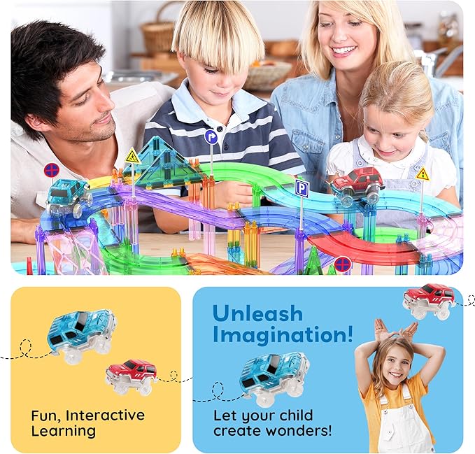 PicassoTiles 150 Piece Race Car Track Building Block Educational Toy Set Magnet Tile Magnetic Blocks Playset 4 Cars Early STEM Learning Construction Kit Hand-Eye Fine Motor Skill Brain Training PTR150
