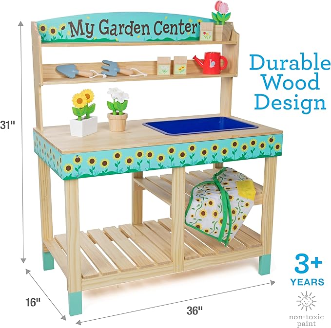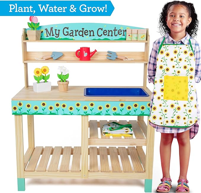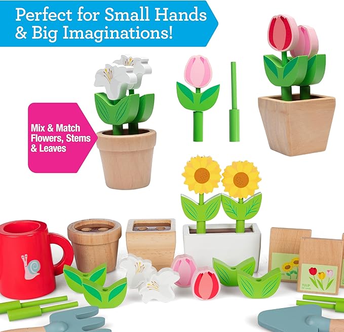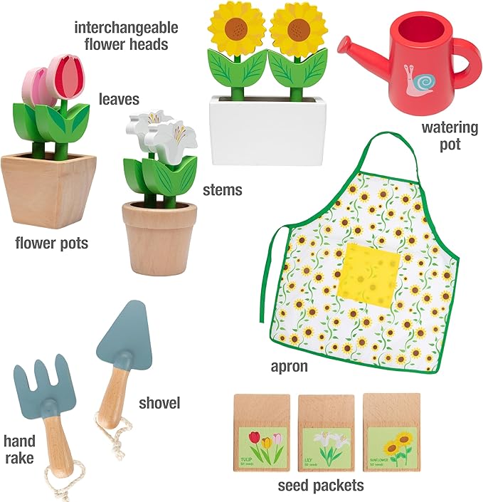 - Over 20 wooden additional pieces included to start your own personal garden: flower pots, seed packets, watering pot, shovel, hand rake, apron, and interchangable flower heads, leaves, and stems