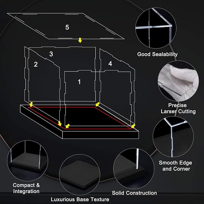- 【Dustproof Design with Lid】: We are using precise laser cutting technology for acrylic sheet layout, 5pcs acrylic sheets are perfect match with each other, almost no gap between each piece of acrylics. The Lid design is convenient for end-user for object changing. Our showcase will protect your products from dust & corrosion.