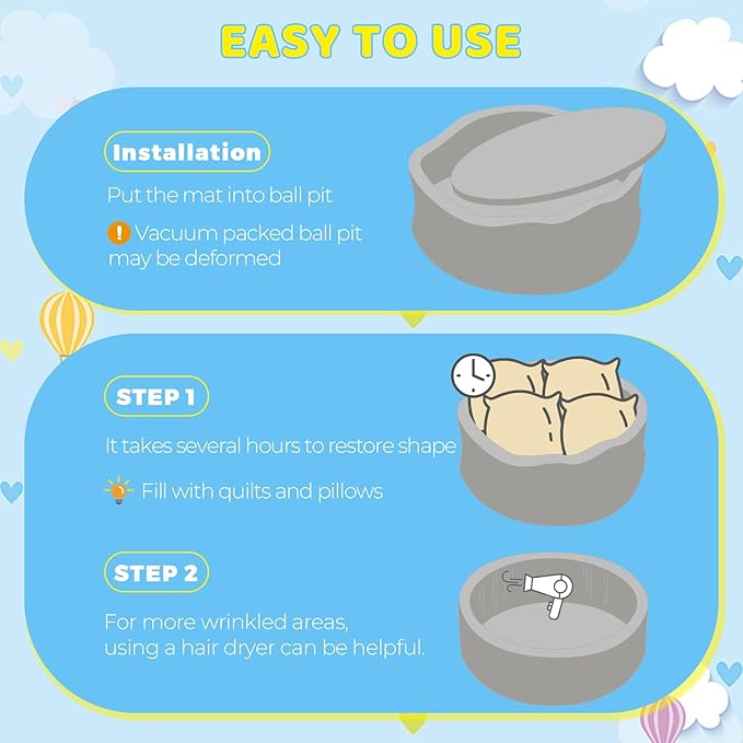 - 【Vacuum Seal Design】 The kiddie ball pit is vacuum-sealed. When you open the sponge, it will expand immediately, but it will not show a perfect circle immediately. It can be placed for 72 hours to wait for it to set. A hairdryer with moderate temperature or stuff the empty ball pit with pillows and blankets will help a lot to shape recovery.