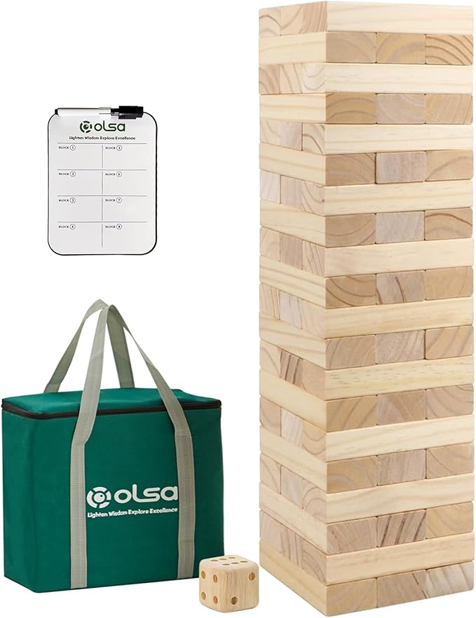 - Includes 600D zippered carrying case for easy storage and transport, allows you to take OLSA wooden block party game to anywhere you want, such as bar, backyard, lawn, park, beach, perfect for indoor or outdoor activities.Our Jumbo wooden game also can be ideal birthday or Halloween Christams gift choice for your families and friends.