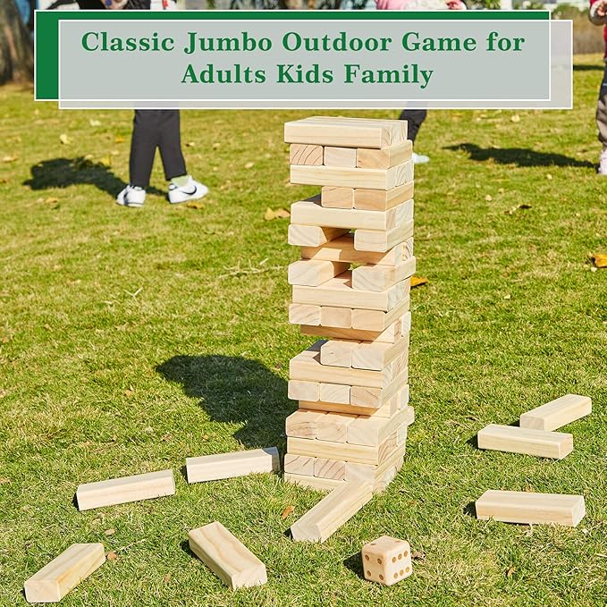 - Our stacking block outdoor games are made from hand picked solid pinewood, which will not to split or crack, provides long-lasting durability. All tower blocks are thoroughly sanded and polished which can ensure it will not hurt your kids or families and effortless pull-outs.