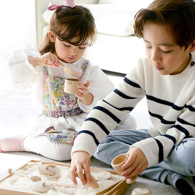 - Transfer, Scoop, and Play! This set of toddler-sized wooden kitchen tools make a perfect addition to any toddler's sensory box. Play with these wooden toys and your sensory bin favorites like beans and colorful rice support the development of hand-eye coordination, fine motor skills, and a childs confidence.