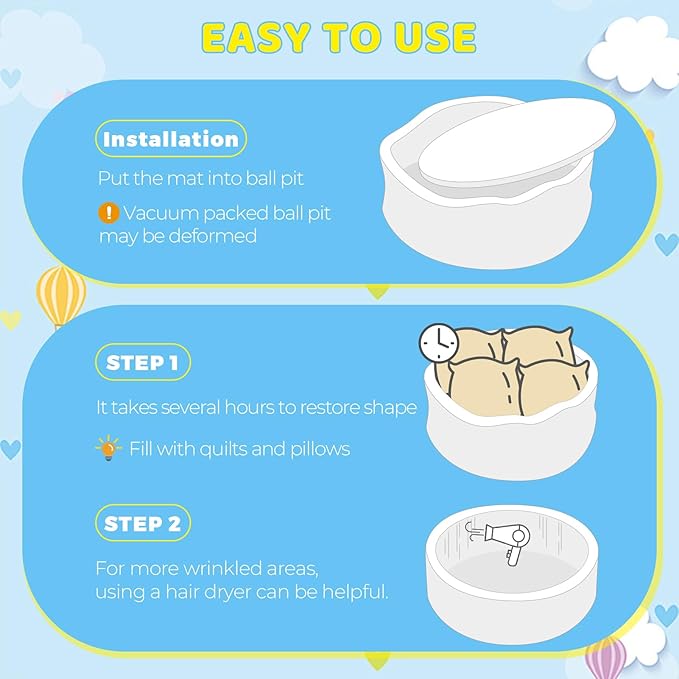 - 【Vacuum Seal Design】 The kiddie ball pit is vacuum-sealed. When you open the sponge, it will expand immediately, but it will not show a perfect circle immediately. It can be placed for 72 hours to wait for it to set. A hairdryer with moderate temperature or stuff the empty ball pit with pillows and blankets will help a lot to shape recovery.