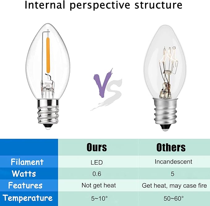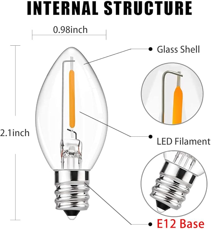 - Energy saving LED Bulbs: Clear glass C7 LED Lights bulbs with E12/ C7 candelabra base. 0.6W per bulbs, 120V, clear christmas lightsperfer Christmas tree, patio, garden roofline pathway lights decoration.If one bulb burnt, the others will steady lit.