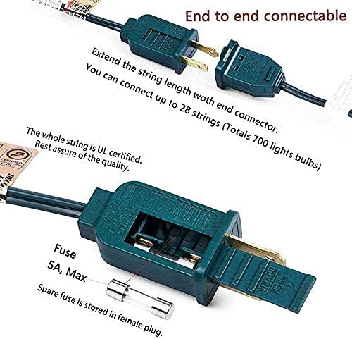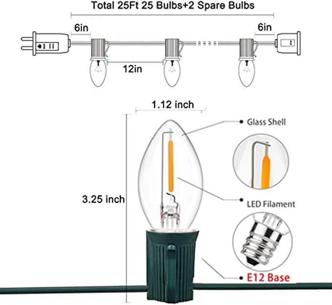- End to End Connectable: LED clear C7 Christmas string lights 6 ''lead with male plug, 12 ''spacing between bulbs, 6 '' tail with female connector, total length 25 feet. 25Ft Christmas Outdoor LED Patio String Lights Connect up to 28 strand to meet your needs, you can hanging christmas light in garden, patio, Christmas tree