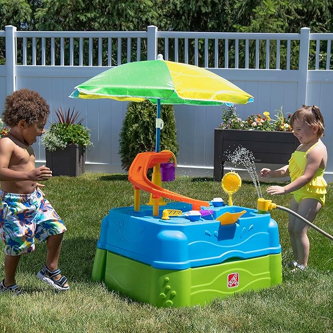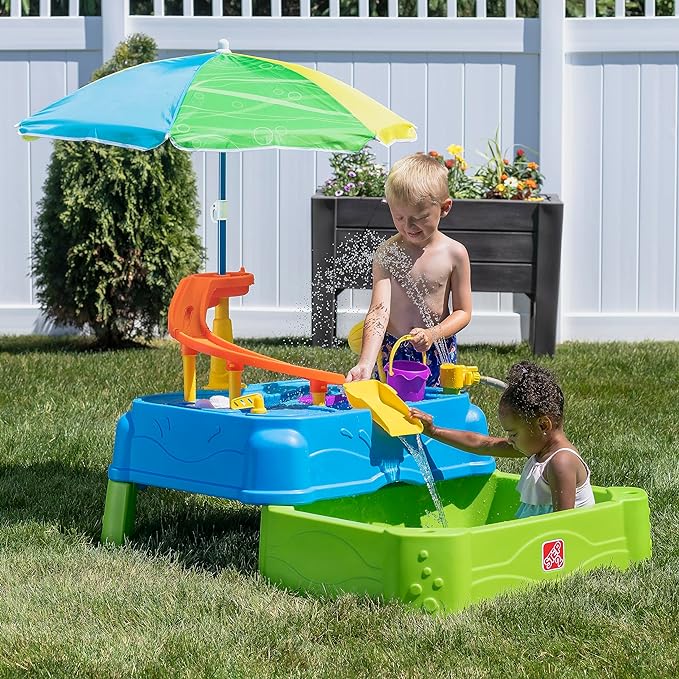 Step2 Waterpark Wonders Two-Tier Water Table, Kids Water Activity Sensory Playset, Comes with Umbrella, Summer Outdoor Toys, 11 Piece Water Toy Accessories, for Toddlers 1.5+ Years Old