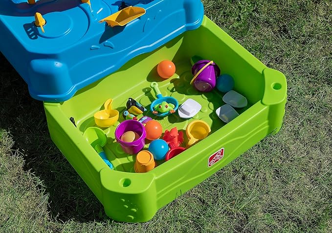 - TWO-TIER: Keep cool with two water tables, space for many kids, upper table holds 4 gallons, lower table holds 6 gallons, 11 piece toy set included for endless fun
