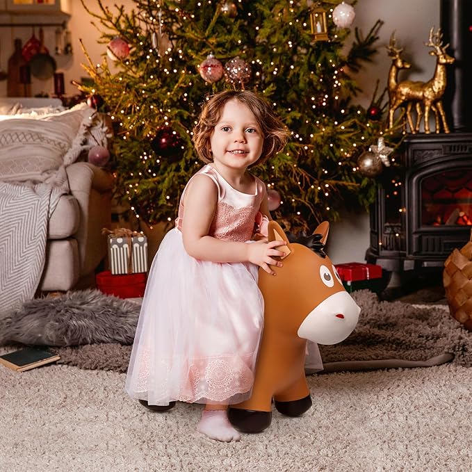 - [EXCELLENT RIDE ON HORSE HOPPER] Designed for stability and safety, this toddler-friendly horse hopper features four sturdy legs and a stable center of gravity for smooth rides. The small horns provide an easy grip, while the ergonomic backrest helps maintain the correct posture during play. It's the ideal bounce and ride horse for kids, whether indoors or outdoors
